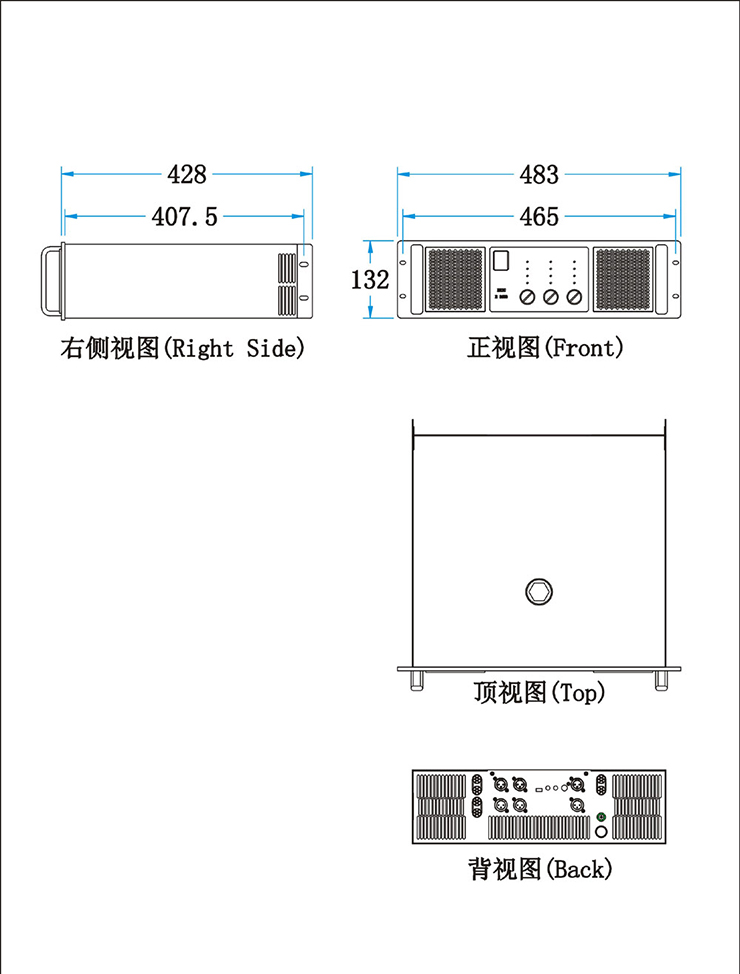 E系列功放三个通道的线路板安装在一个牢固的 19"3U 的标准机箱中, 采用高强度冷轧钢板机箱,铝合金面板,静电喷涂高硬度烤漆,以应对频繁的流动搬运。 采用了全对称式结构, 且采用前进后出吹风风道式高效散热系统,保证了功放长期稳定的工作。